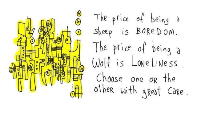 I wanted to include Hugh MacLeod’s lovely sheep and wolf drawing so I added Note 1 because it vaguely relates to the drawing. I love MacLeod’s art, although his website has gone very commercial and less edgy. If you want to see samples of his art, Google “hugh macleod art” and click on the Images tab.