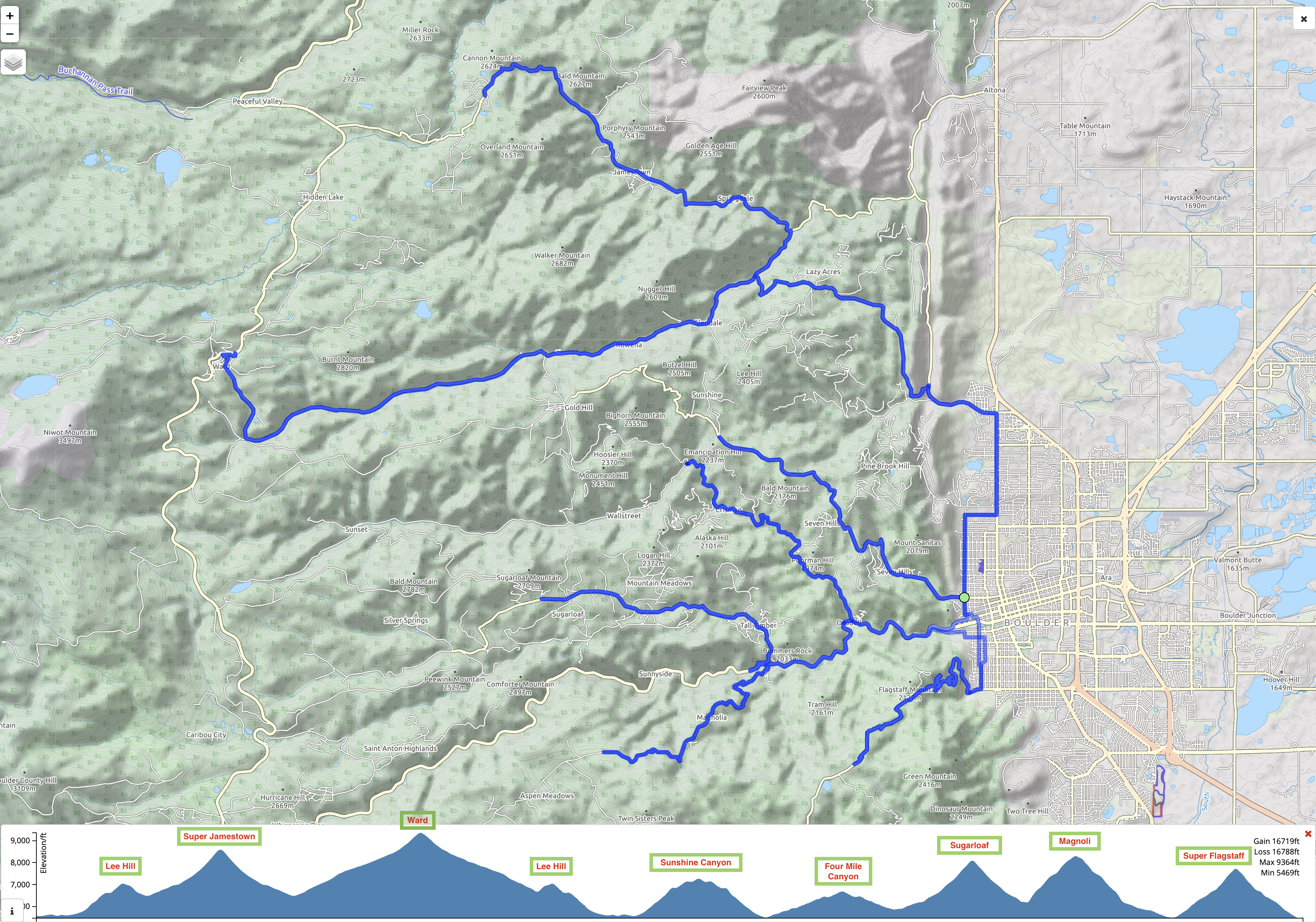 Rocky Mountain Cycling Club at one time put on a slightly easier, but still fearsome, ride they called the Fearsome Five. It covers much of the same ground but includes some gravel by continuing up to Gold Hill from Salina, then down Sunshine Canyon. There’s also a page for the Fearsome Five on RideWithGPS.