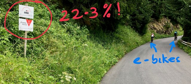 But still, it’s an amazing ride, made even more amazing by the final two kilometers, where you ride up a cobblestone road to the Edelweißspitze. Apart from the initial flat and flattish section, it has a pretty consistent gradient the whole way. We rode from Zell am See, but some people start in Bruck and some in Fusch. For us the round-trip was 64 km with 1,794 meters of climbing.