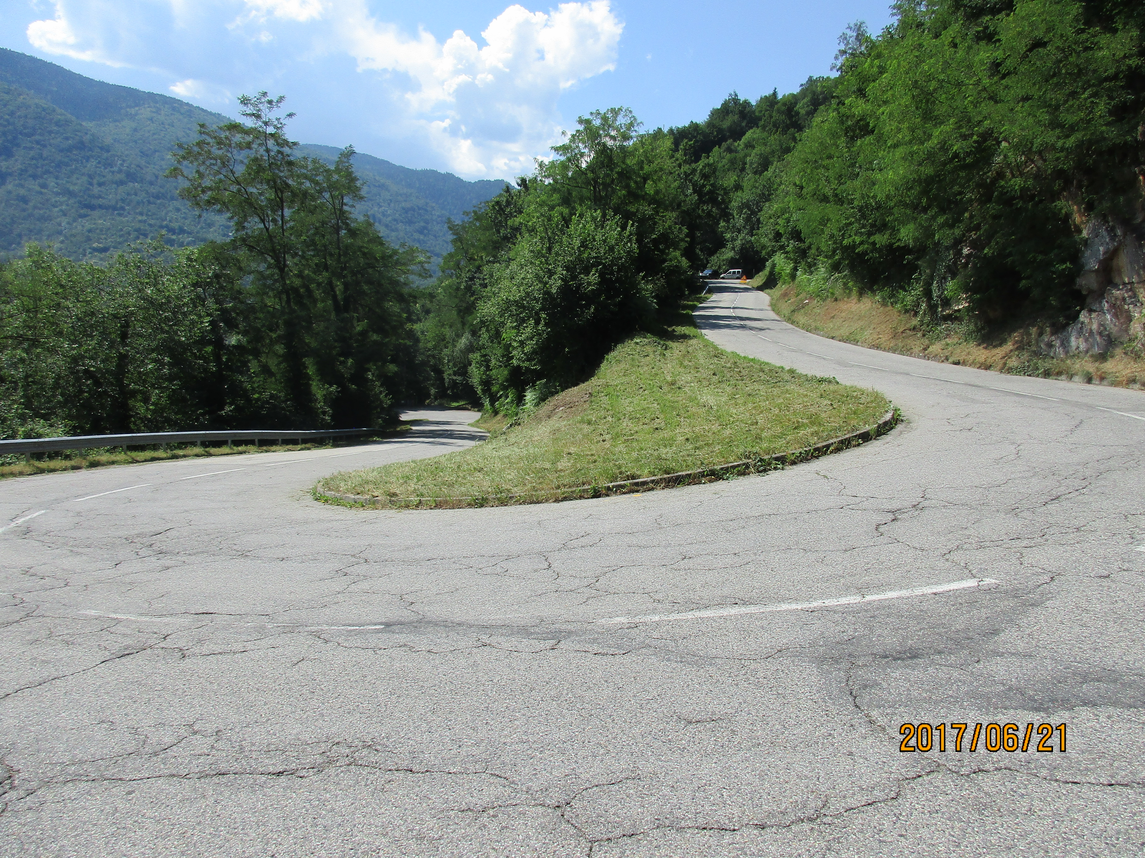 At the intersection there is a sign telling you that it’s 15 km to the top with 1,216 meters (3,990′) of climbing. But the climb is not well signed and there is no indication at the intersections of which way to go.