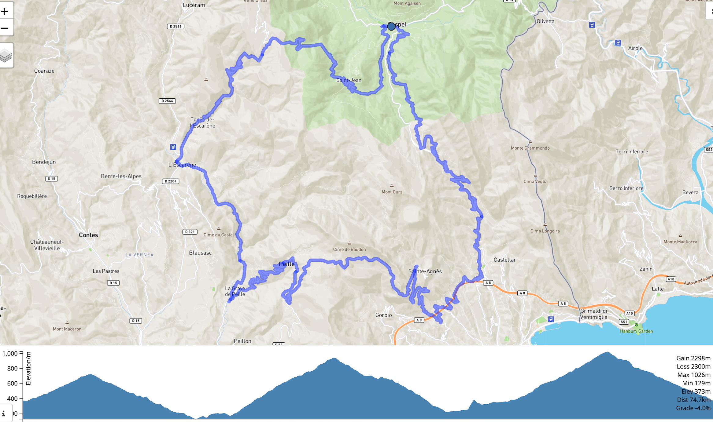 This is a fun and very varied little loop of 44 km (27.3 miles) with 925 meters (3,035′) of climbing. It crosses into Italy then back into France. The ride feels much longer than it actually is.