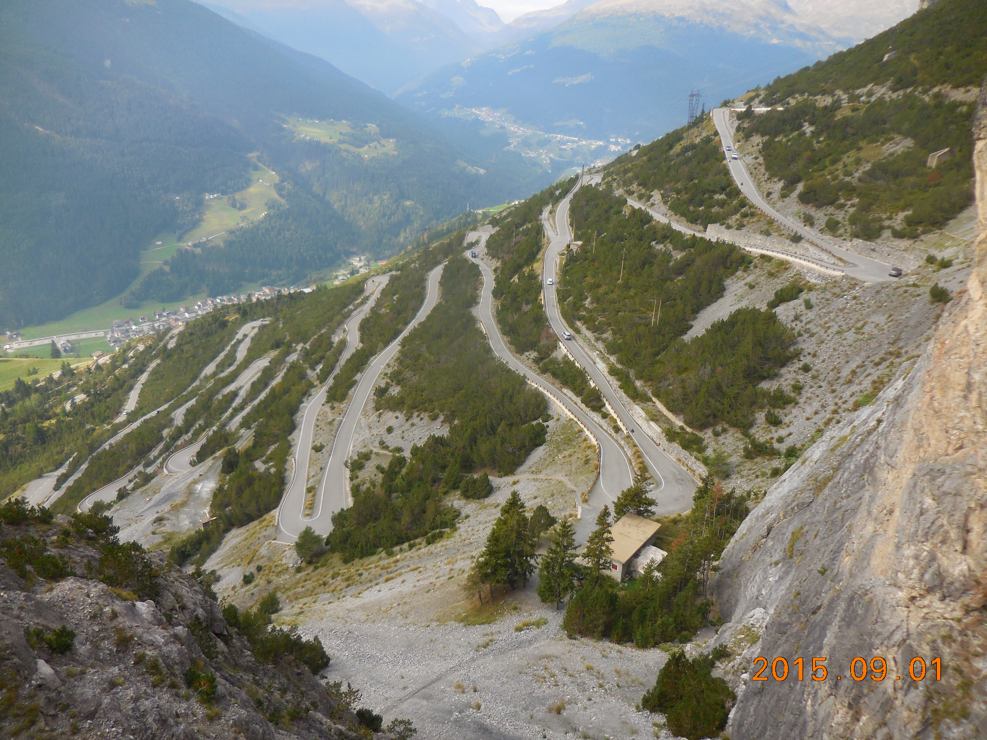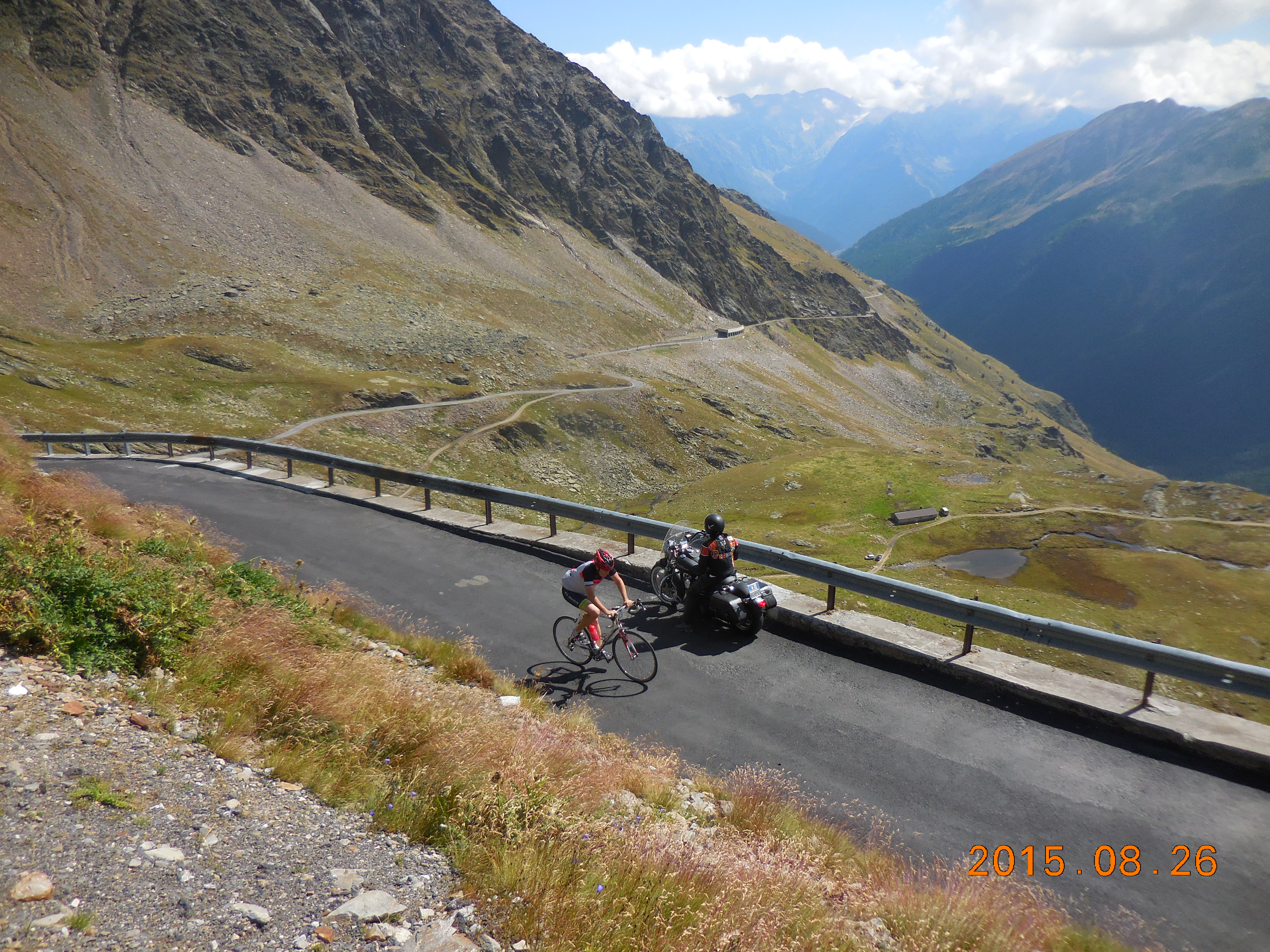 The road surface is very good except for the last 2 km which has a horrible surface. The climb starts fairly sedately for 7 km but about 10 km from the top the road narrows and steepens dramatically. Some of the next section felt as hard to me as anything on the Mortirolo (maybe because the Mortirolo had already worked over my legs). The upper part is remote and wild. About 3 km from the top you go through a tunnel, for which a rear light is useful. After the tunnel you have a series of switchbacks to finish. Then you have the lovely long descent of the north side. Some of the switchbacks just above Santa Caterina Valfurva are really tight and easy to take too fast.