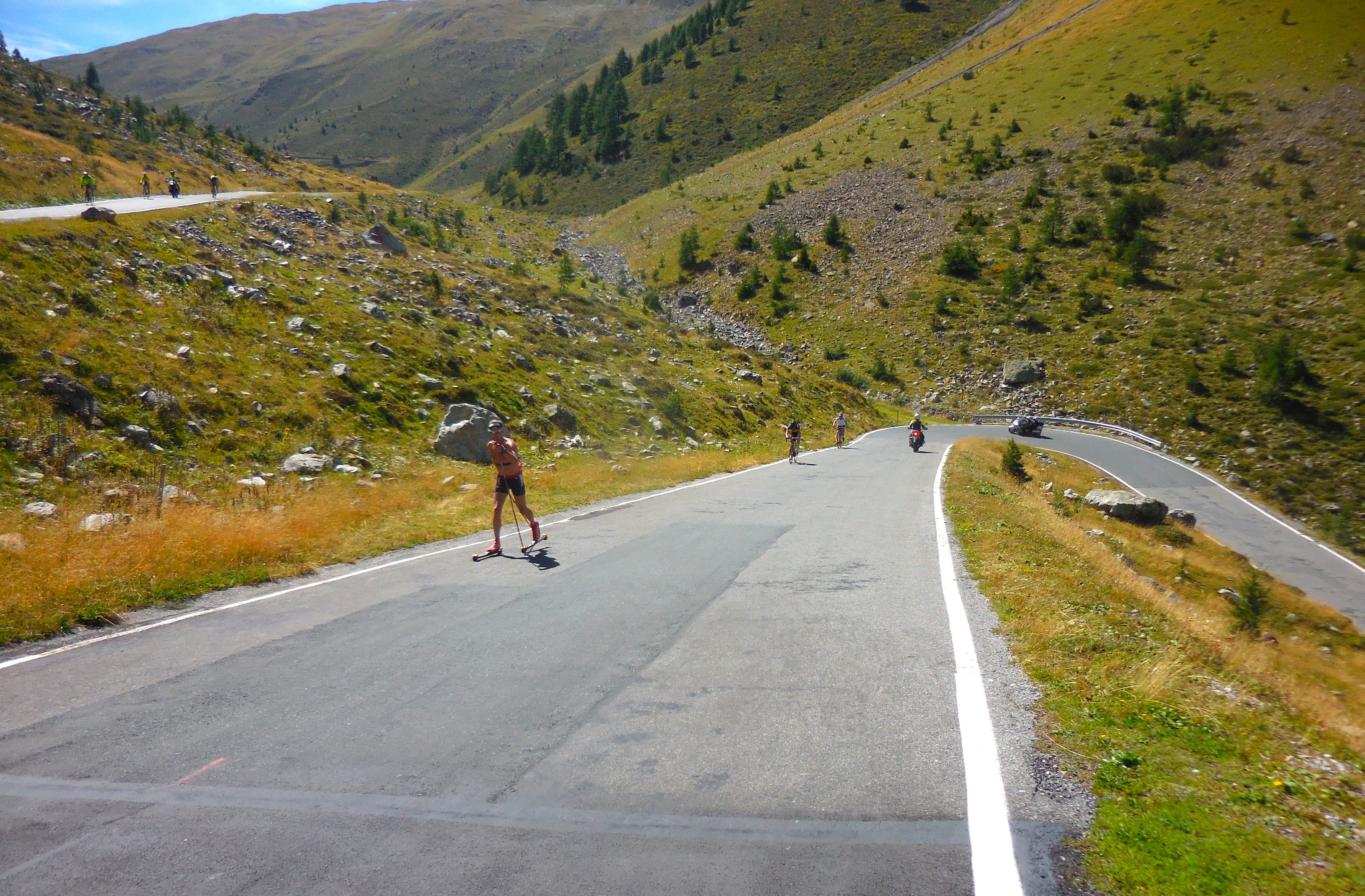 After you get through the tunnel, turn right and head over Ofenpass (also called Pass dal Fuorn). This whole valley is very pretty and quite different to the Italian side. From the top of the pass descend to Santa Maria im Müstair and in the center of town turn right, following the signs for the Umbrail pass. There are some beautiful switchbacks before you reach the upper valley. Until recently there was a section of dirt about a mile long in this valley but the road is now completely paved. (There was a XC skier on roller skis who skied past me on the Umbrail – and kept going up the Stelvio. Impressive.)