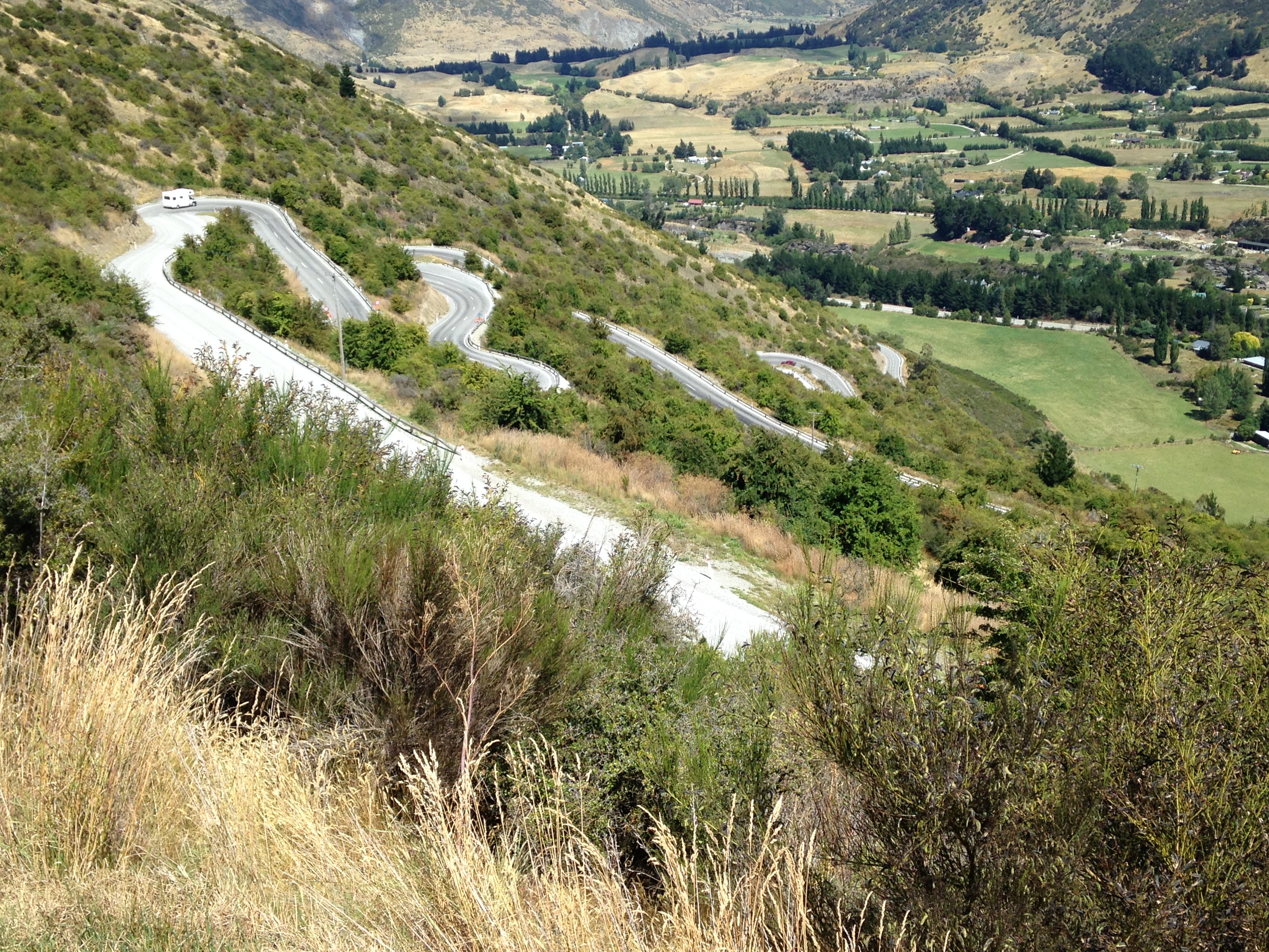 This is a great ride. Both sides are good, but the direction from Queenstown to Wanaka is the best as it’s more varied and has more bends. I did it both ways, starting at Cardrona on the Wanaka side, riding over to the base of the switchbacks on the Queenstown side, then back up. The Cardrona side climbs gradually up the valley, very easy gradient at first, then steeply up the final few kilometers. My Garmin was showing a consistent 12% with patches of 13-14%. I’m never sure how accurate these GPS-based inclinometers are though, especially when you are moving slowly.