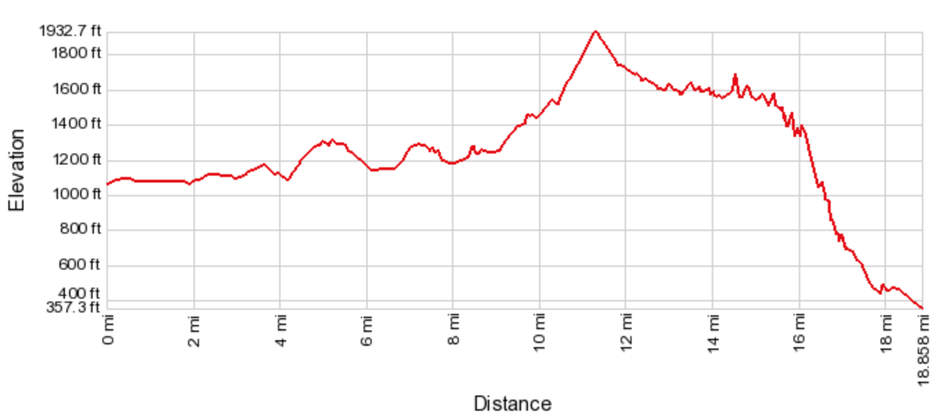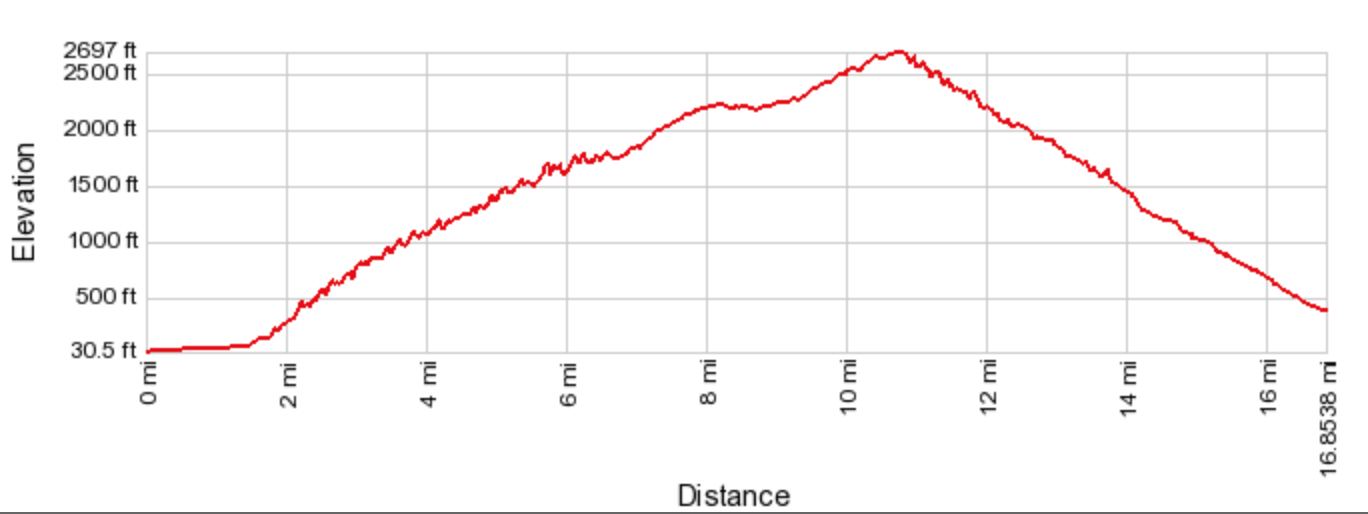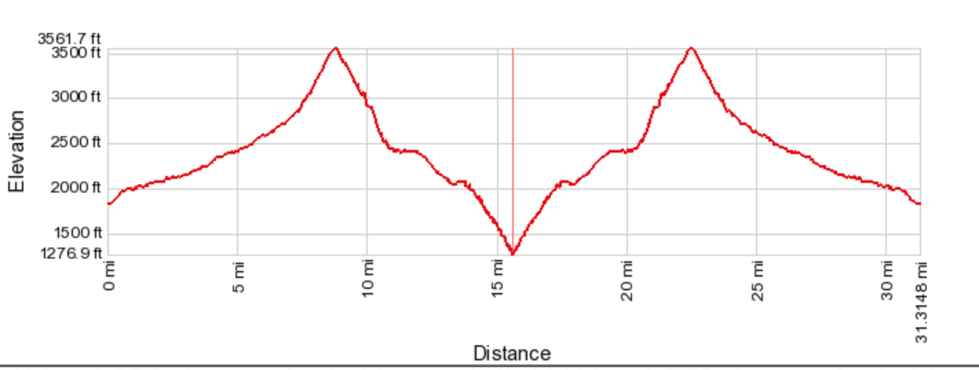The whole ride, doing both sides, is about 54 km (34 miles) and has about 5,662 feet (1,726 m) of climbing according to Google, or 5,204 feet according to my Garmin 500. According to my Garmin the ascent from the east was 2,677 feet (815 m) and from the west was 2,260 feet (689 m). You’ll notice that the figures don’t quite add up, and don’t match the summit elevation of 791 meters. This is because there is some rolling terrain near the summit that adds a few feet on the eastern descent.