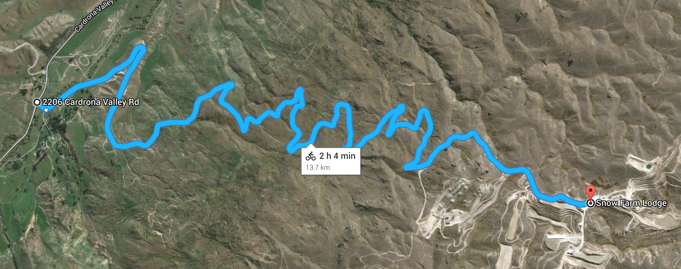This ride is about 12.4 km with 3,684 feet of climbing. It starts about 2 km north of Cardrona, and about 200 meters north of the road up to Snow Farm. A good ride to combine with Snow Farm.