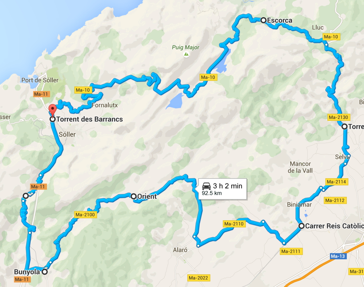 A great loop which starts with a lovely flattish section along very quiet country roads, then climbs the wonderful road to Coll de sa Batalla to the Ma-10 near Lluc, then descends the Ma-10 back to Pollença.