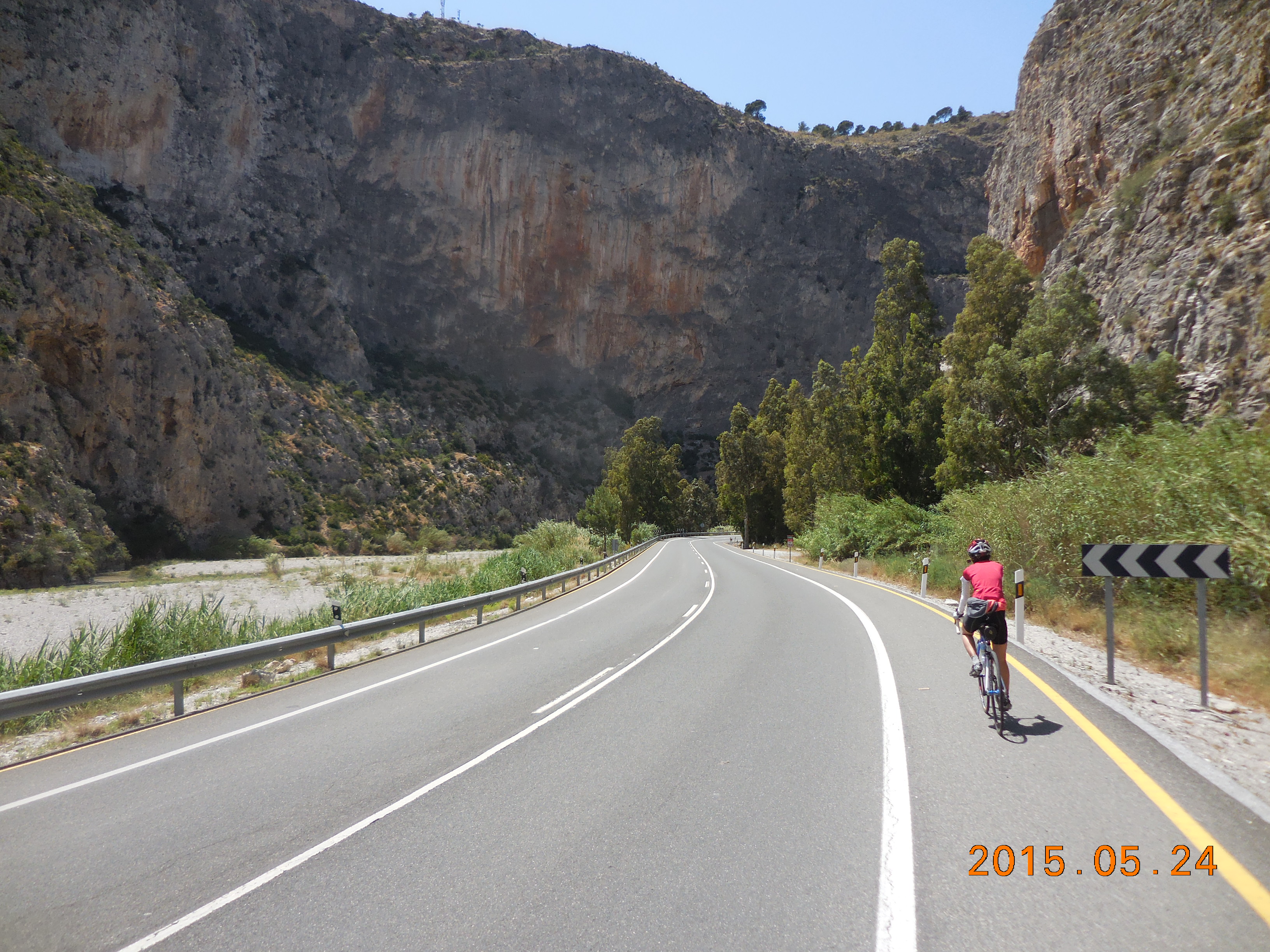 An easier ride than some of the other rides around Órgiva, it still has some good climbing south of Vélez de Benaudalla, and riding back from Vélez to Órgiva. For much more climbing you can come back the same way from Motril, but this page describes a different way back, one that is much easier and which goes through a spectacular rocky canyon. It is still about 71 km with 1,140 meters (3,740 feet) of ascent.