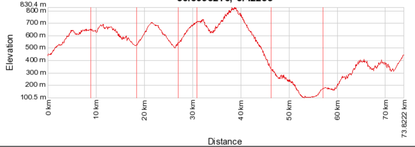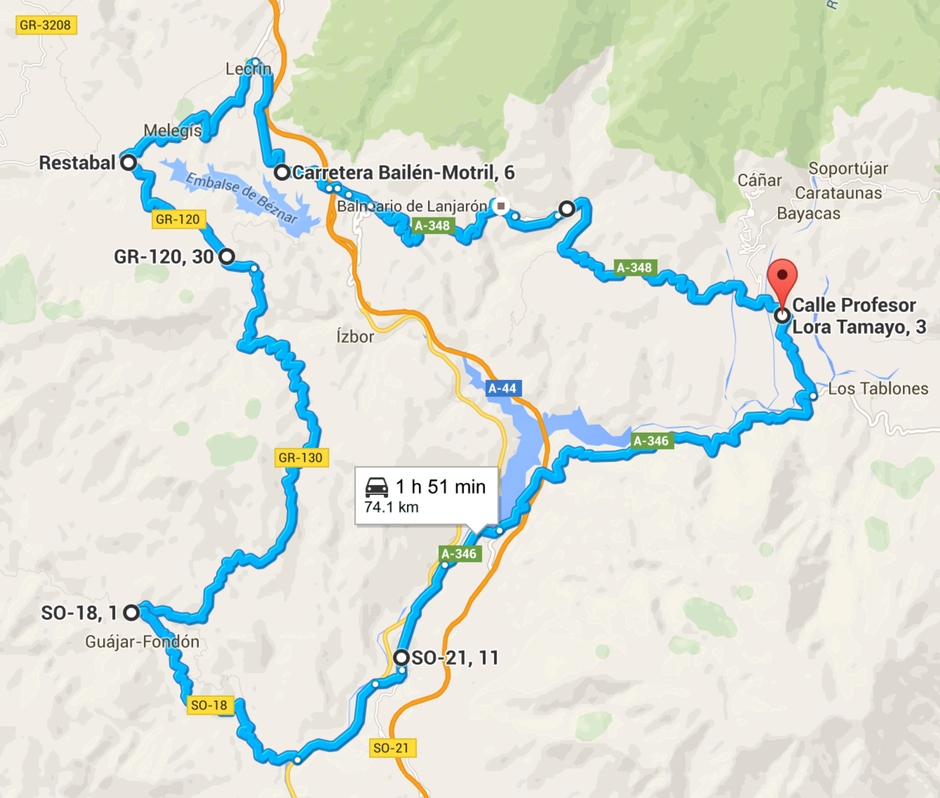 Órgiva – Lanjarón – Beznar – Talará – Restábal – Pinos del Valle – Guájar-Faragüit – Vélez de Benaudalla – Órgiva. The ride is about 74 km (46 miles) with 1,500 meters (4,921 feet) of climbing.