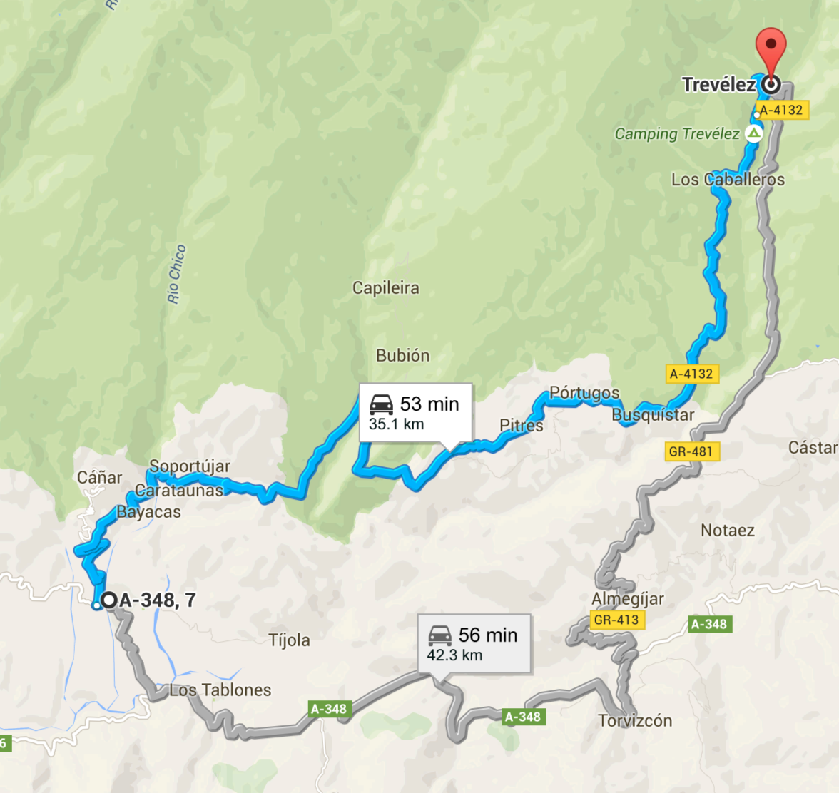 Starting in Órgiva, follow the A348 west over the one-lane bridge and up to the Hotel Puerta Nazarí. Just before the hotel, turn right onto the A-4132. Follow the signs for 34 km to Trevélez, passing Carataunas, and going through Pampaneira, Pitres, Pórtugos, Busquístar, before heading up the final valley to Trevélez. This last section of road is not of quite such quality as the rest of the road. Finish in the center of town at the bottom of a long descent.