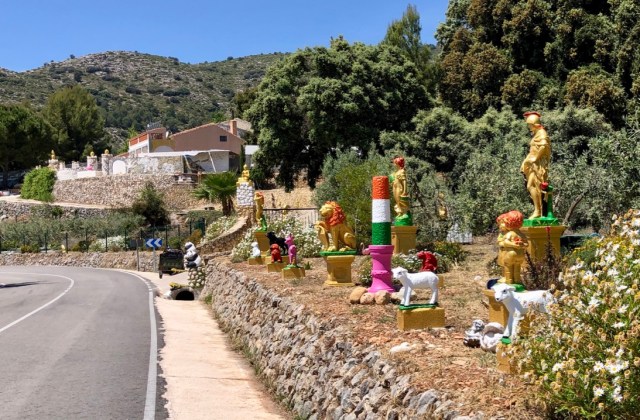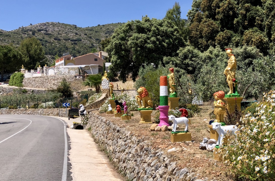 A fast descent down the other side leaves you believing it will be downhill all the way to Tàrbena, but don’t get your hopes up. The road rolls, then finishes with another climb to the outskirts of Tàrbena. Just before Tàrbena you’ll see an amazing house and garden filled with gold statues, white lambs, pandas, golden buddhas. The photo here doesn’t do it justice.