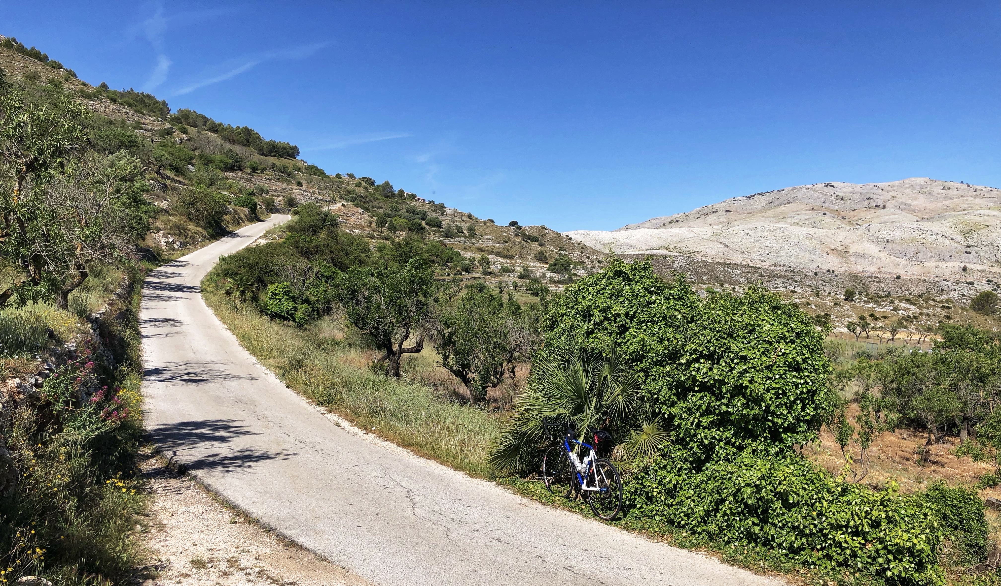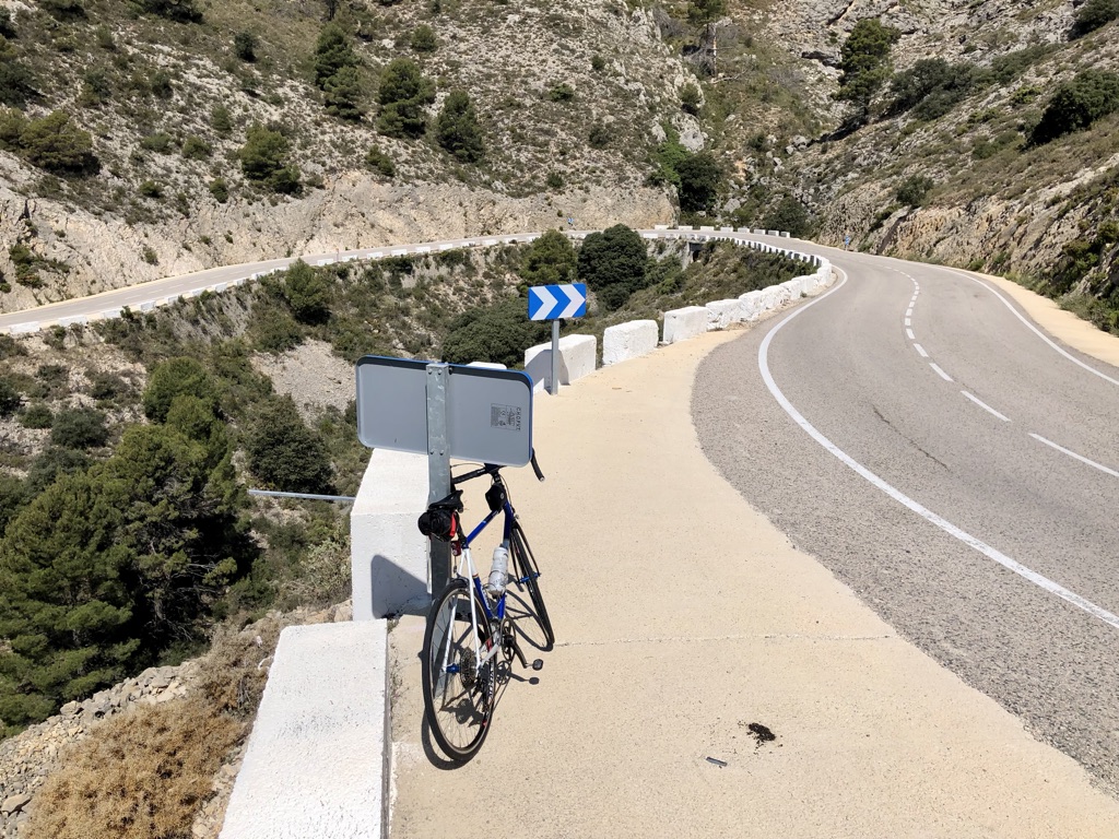 After Sella you are riding more in the trees so the views also disappear until you reach the Port de Tudons and the views open up in front of you. Turn left here and head down the CV-785 to Penàguila, which you reach in about 8 km. I turned round where the main road reaches the city exit sign. Climb easily back up to the Port de Tudons, making sure you turn left after about 7 km, onto the unsigned white road. And remembering to turn left for Finestrat about 5 km below Sella 😀.