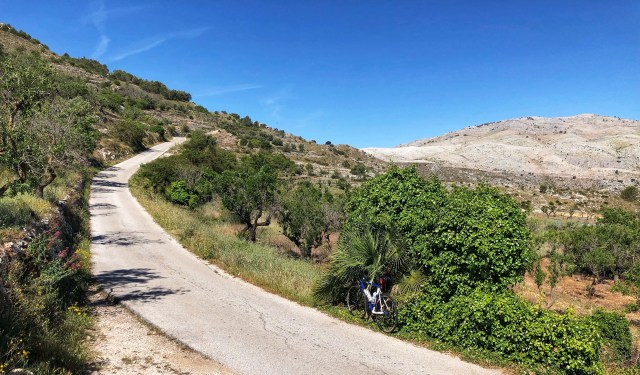 Descend through Tàrbena to Bolulla, with some lovely tight switchbacks near the bottom. Turn around at the 4-way intersection and climb back up to Tàrbena, with big cliffs ahead of you, and initially through small pine trees. The gradient is generally easy, with a few short sections of 9%.