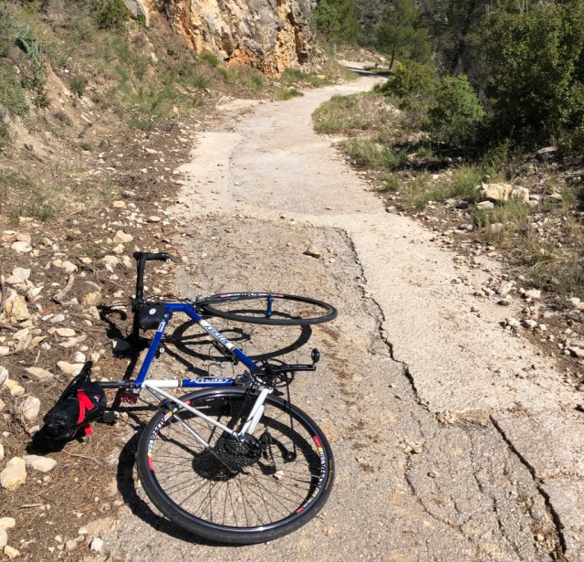 The second climb, Mas de Llopis, is a lot longer, and sections of it are on a much rougher road. Don’t do it unless you are up for an adventure. The picture below shows some of the road in the last 2 km; fortunately the earlier road (shown above) is much better. The ride is steep with plenty of 12-21%. When it reduces to 10% you feel this is resting time 😀. I stood in my easiest gear for all the steeper sections.