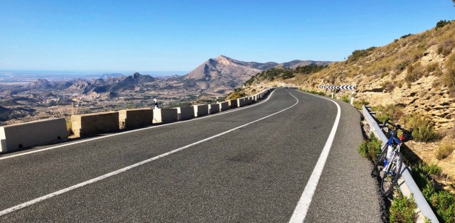 From Castalla the road rolls for a few kilometers before rearing up. Shortly after it steepens you’ll see a sign on the right saying 20%. It’s not all 20% but most of it is steep, with a couple of sections reaching 20%. In less that 4 km of steep climbing you reach the top. Descend down the other side to Petrer. The final 3 km are on a much wider, smoother road with a good shoulder. This is great on the descent, but climbing back up I enjoyed the quieter, narrower, twistier road above more.