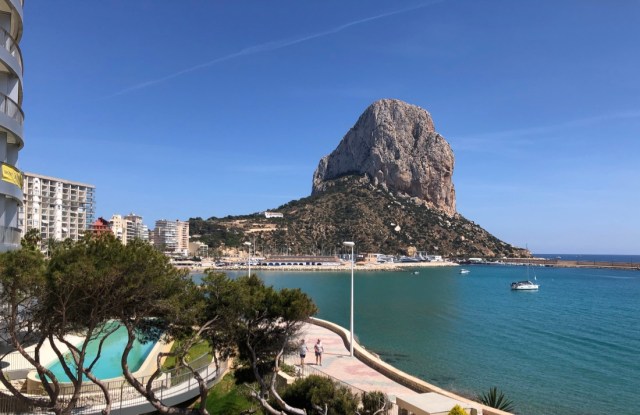 Calp (sometimes with a trailing ‘e’) is a nice tourist seaside town, with sandy beaches and clear water. There’s lovely promenade along the seafront (as you can see in the photo above), and a spectacular cliff at one end, the Peñon d’Ifach. This cliff appears to be almost insurmountable except by rock climbers, but there is a path up it that seems to end below a cliff, but then continues through a 100 foot tunnel created in 1918. Apparently you need to book an appointment to hike to the top.