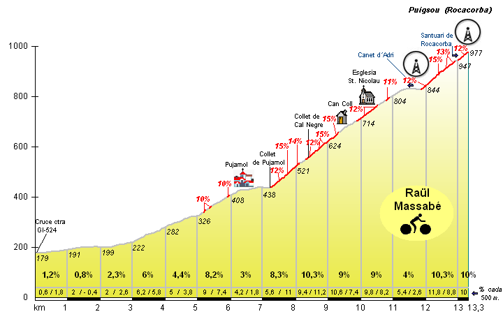 Here’s the Ride with GPS page for the closest climb to Girona, Montjuïc. This is a fun climb from both sides with the over-and-back being about 12.5 km with 1,000 feet of climbing. There are sections of 10-12% on both sides. The Girona side is urban and residential, while the other side is rural with a feeling of remoteness and adventure.