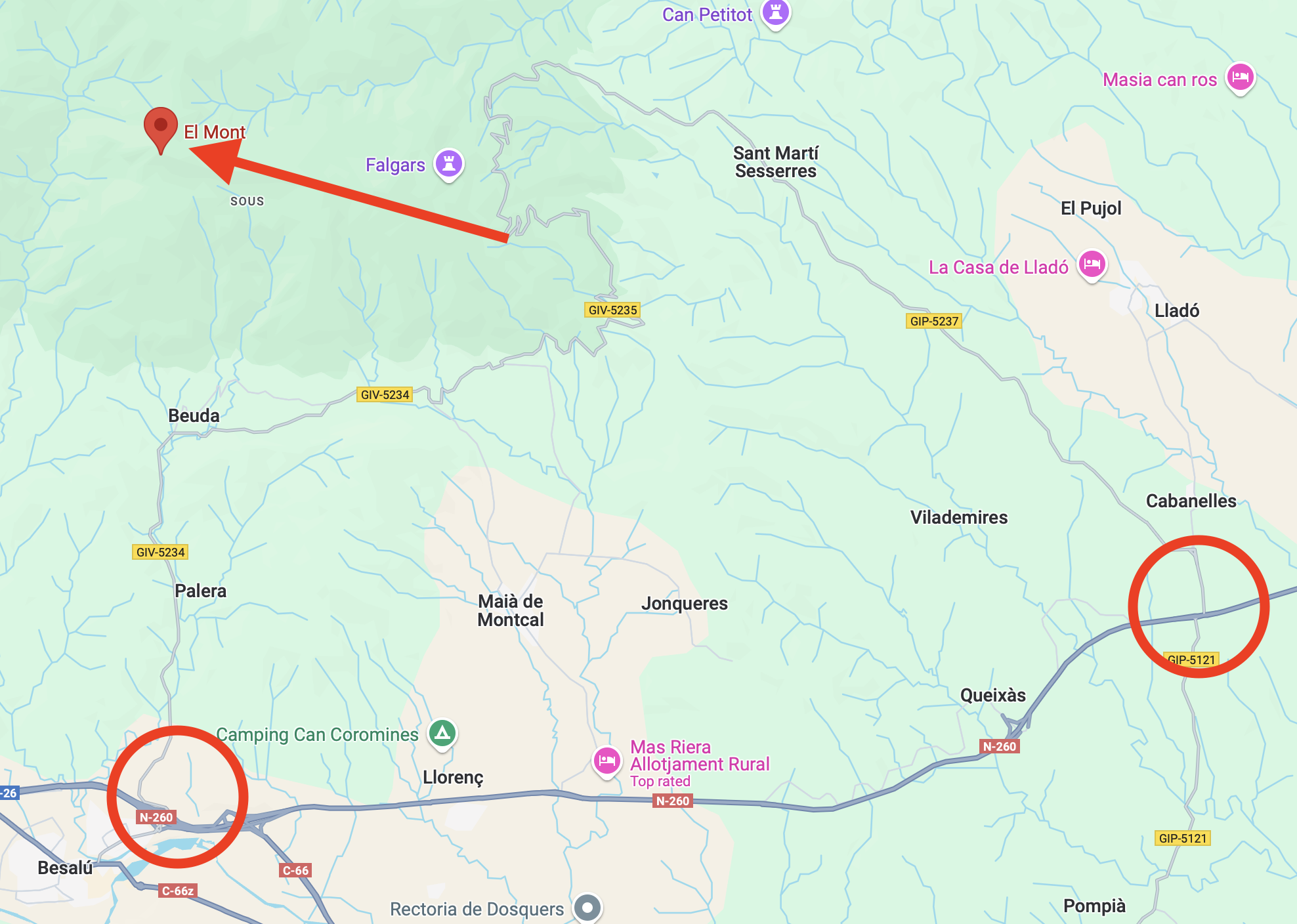 From Girona drive up the C-66 to where it ends at the A-26 to Olot and the N-260 to Figueres. Take the N-260 to the right and follow it for about 9 km to a junction where you turn left for Cabanelles. Drive for about 500 meters to where you can park on either side of the road, just before the left turn for the GIP-5237 to Mare de Déu del Mont.