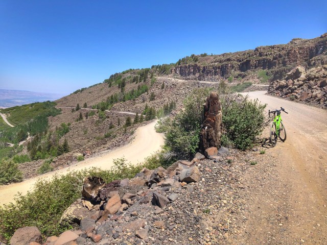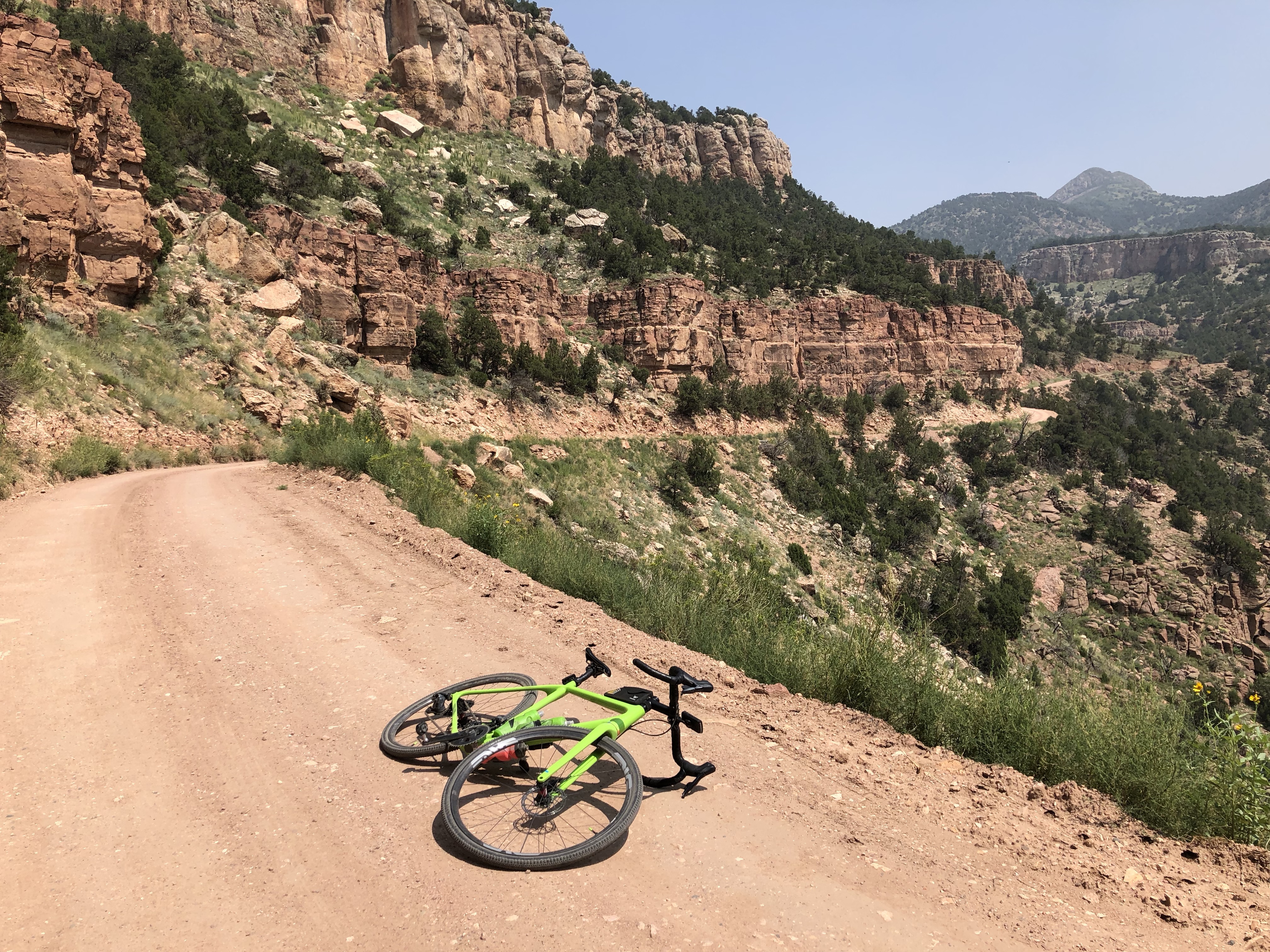 The third big climb up Grand Mesa is up a paved then dirt road to Land’s End. The dirt road part is beautiful, with many switchbacks and gorgeous views, especially on the way back down. The whole climb is 21 miles with 5,100 feet of climbing. The riding is never particularly steep but is fairly consistent. I rode it on a mountain bike in 2013 and then again in 2021 on a gravel bike.