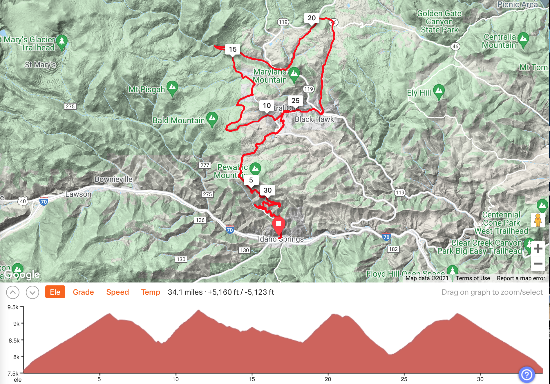 This is a wildly varied ride, filled with long descents and steep climbs, mainly on gravel but with a brutal stretch of paved uphill through Blackhawk and Central City. The whole ride is about 33.5 miles with 5,050 feet of climbing. But it feels much longer and harder than the numbers suggest. I thought this was one of the best gravel rides I’ve done in a long time (7/26/21).