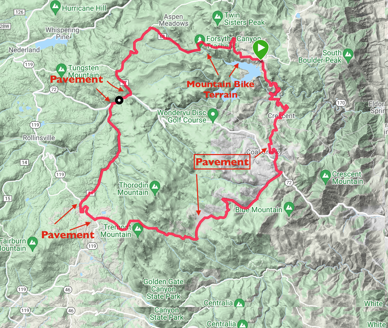 We rode this loop after seeing it on Ride with GPS. The author described it as “technical riding sections, minimal pavement with amazing views and little traffic. My new favorite local ride.” The author started in Coal Creek Canyon, which has the advantage that you finish with the sensational paved downhill.
