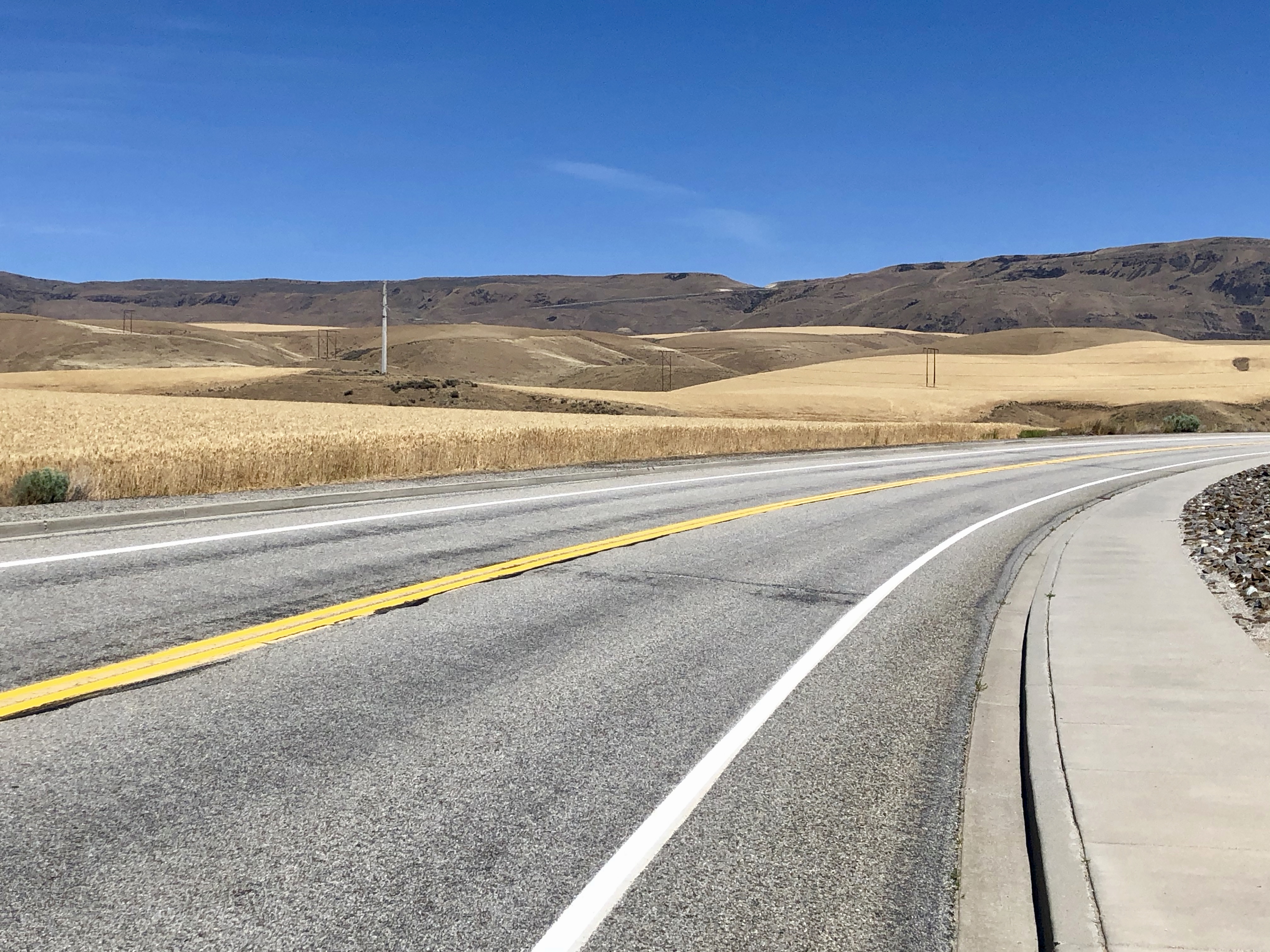 The first two miles of Badger Mountain Road are through a somewhat residential area but after two miles everything opens up and you see the view in the photo: open, spare, bleak, and “amber waves of grain” — at least in July.