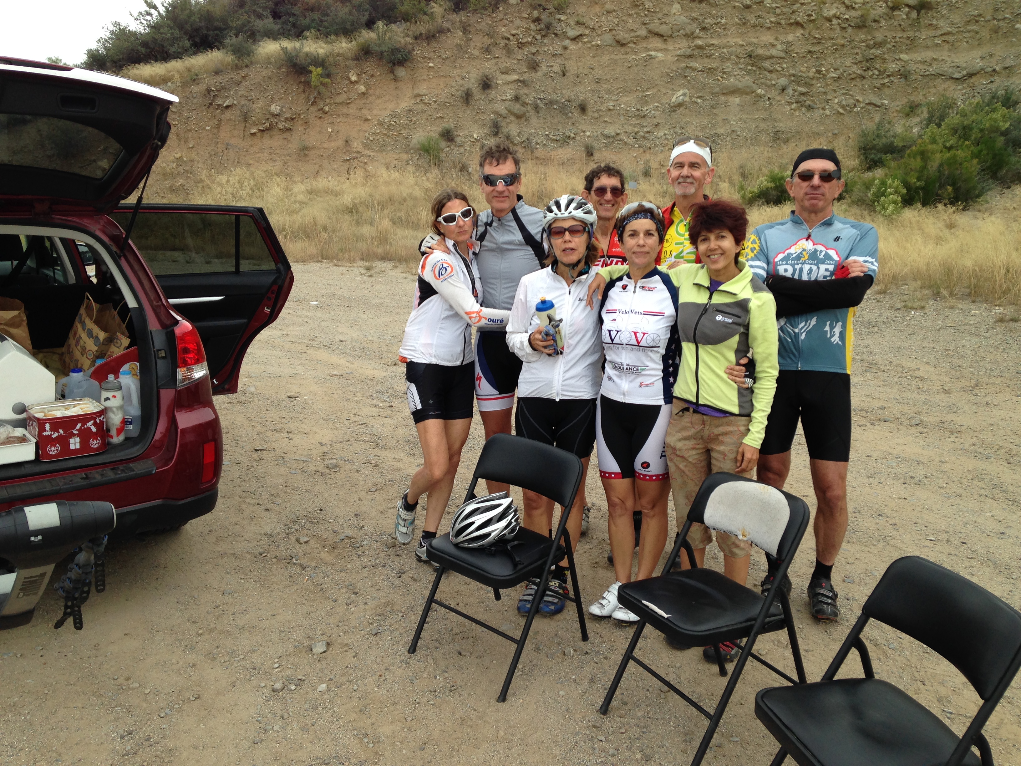 We did the ride as a group of 8 riders with Tanya providing support. The obvious places to stop for food, drink, and rest are at roughly: