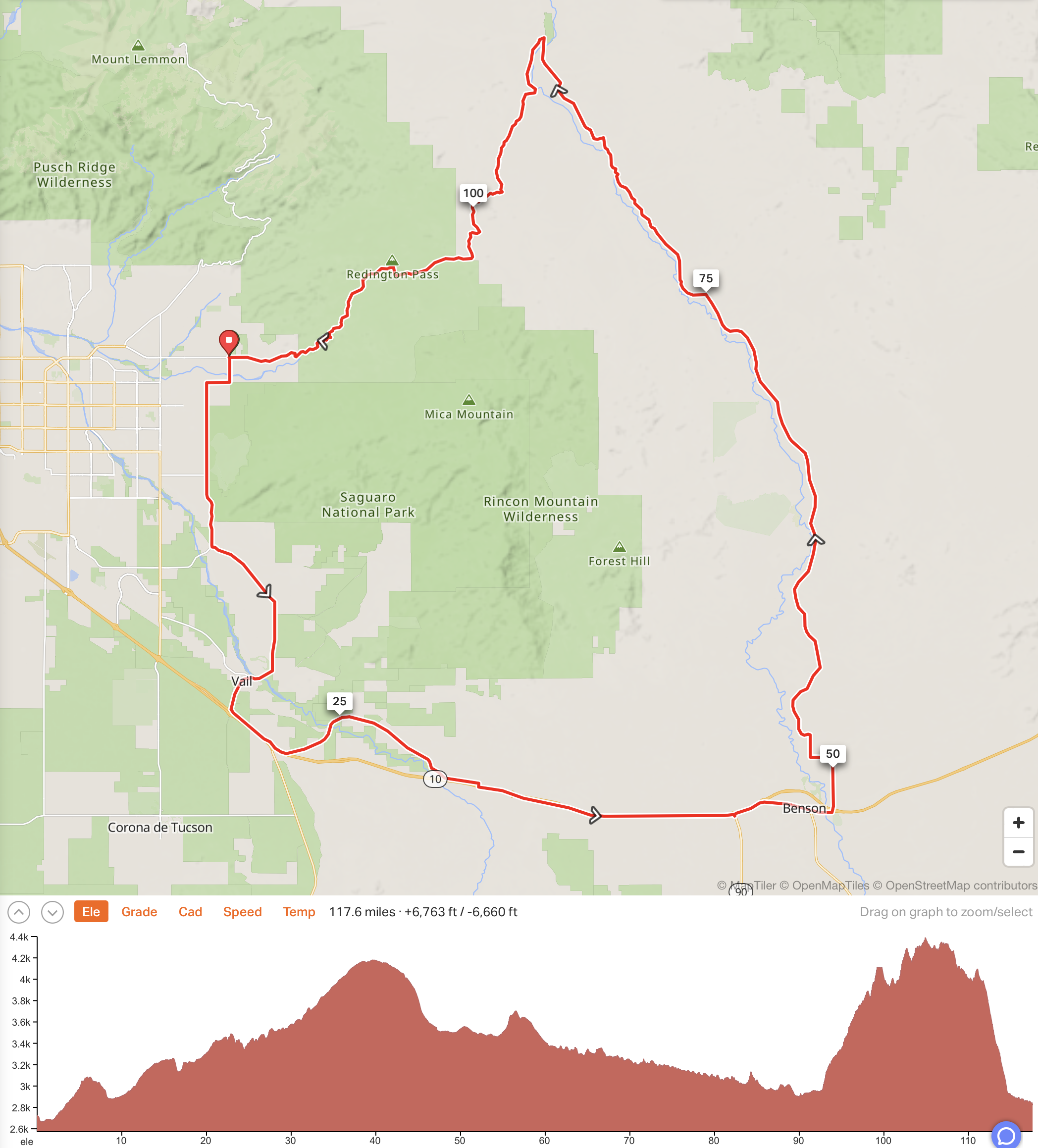 This is a tough loop around the Rincon Mountains, about about 117 miles with 6,400 feet of climbing. Approximately 71 miles are on pavement and 46 miles are dirt, 24 of those dirt miles being up and over Redington Pass. You can obviously ride it either way and I chose to do it counter-clockwise so the hardest riding was at the end 😁.