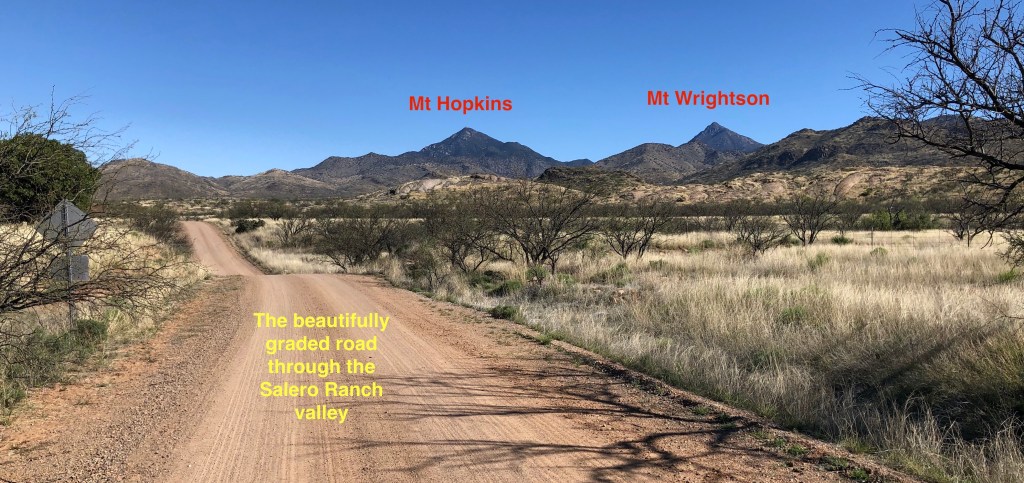 The road is well marked and very obvious and it’s almost impossible to get lost on it. The first few miles have some downhill but are mainly uphill, on a somewhat rough road. At about 6 miles you get into the real hills, and reach the high-point of the ride at around mile 8. A beautiful downhill (which is one of the best hills on the way back) and more uphill brings you to a signed intersection just after mile 10. Turn right here, and in a few hundred yards you start the long descent into the Salero Ranch Valley.