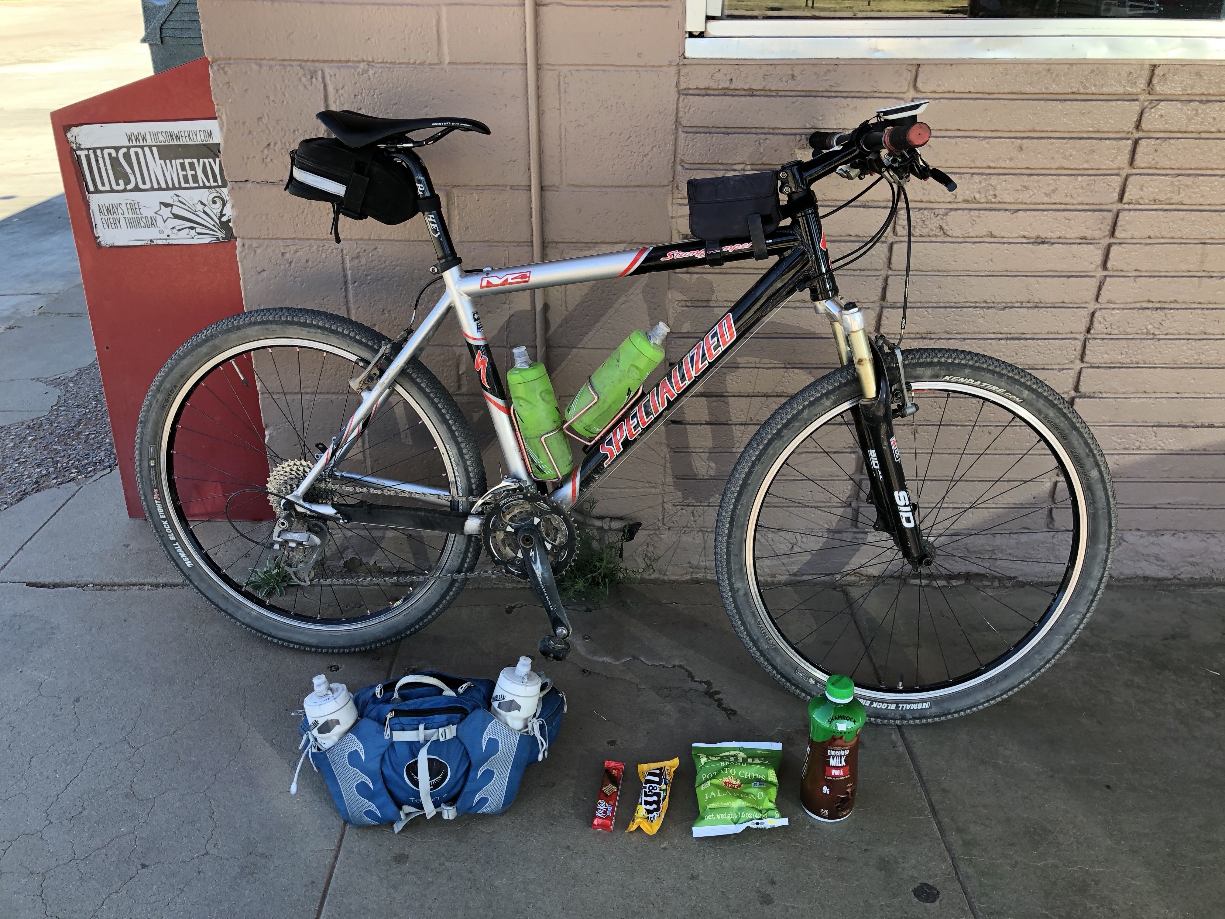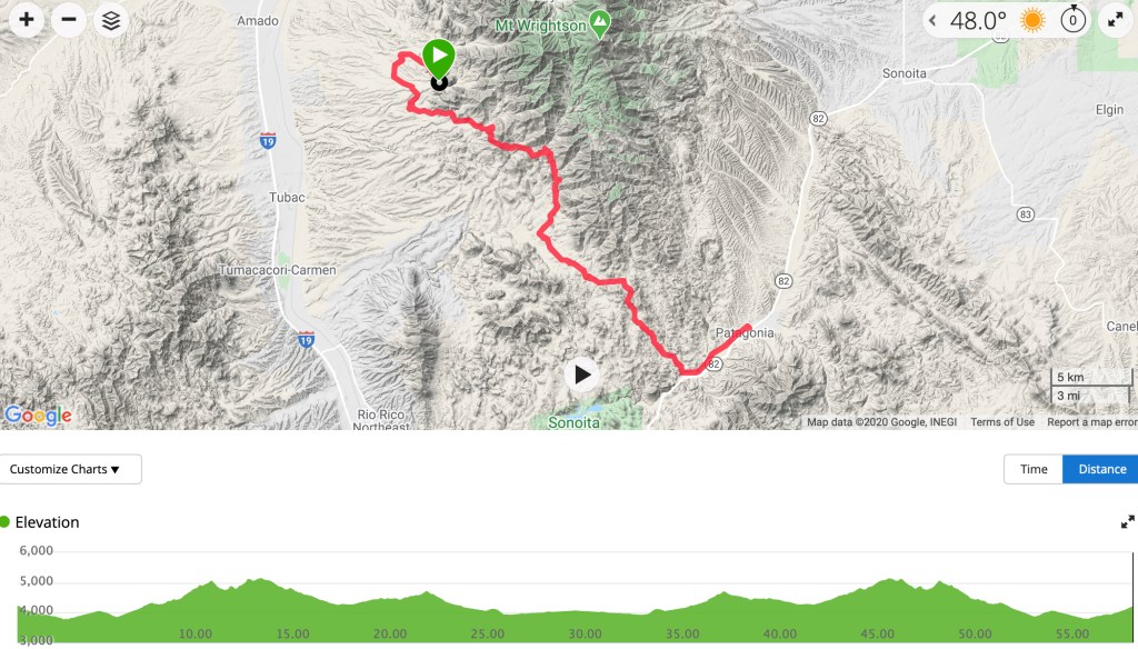 I parked at the Whipple Observatory Visitor Center on Mt Hopkins Road, and rode to the Patagonia Market in Patagonia where I refueled, then rode back. The whole ride was just over 57 miles with 5,717 feet of climbing. I rode this 5/20/20.