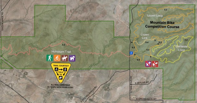 McKenzie Ranch has two main trail areas: on the left is the Hohokam Trail, a multi-use out-and-back trail, and on the right, the Competition Course.