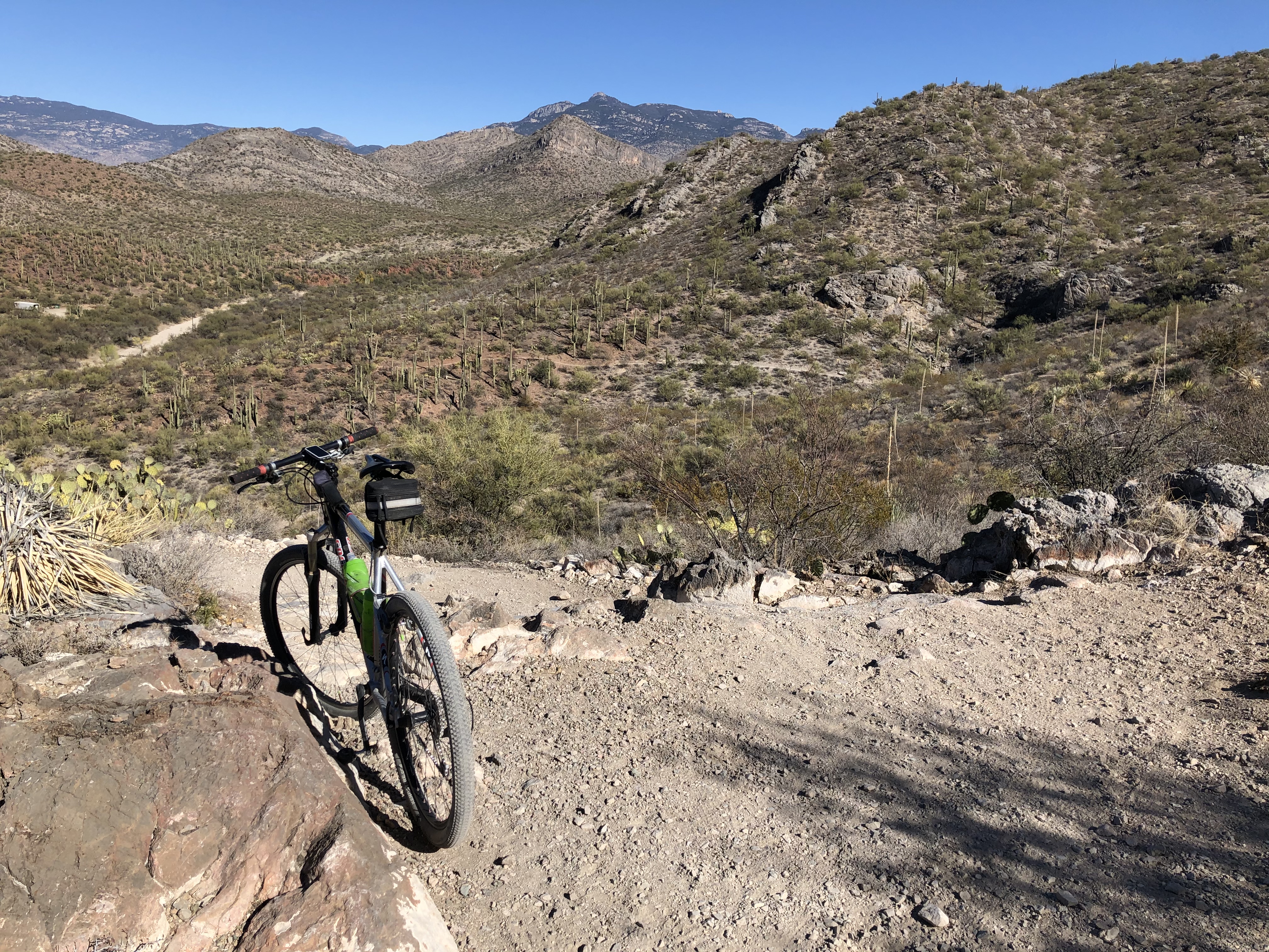 I’ll describe this from the Pistol Hill trailhead. Basically follow the trail south for about 9 miles. It’s well marked with signs for the Arizona Trail. The initial section is sandy and flowing but the next section is the rockiest part of the trail. None of the rocky sections are too bad, although I walked my bike over a few, especially on the way back.