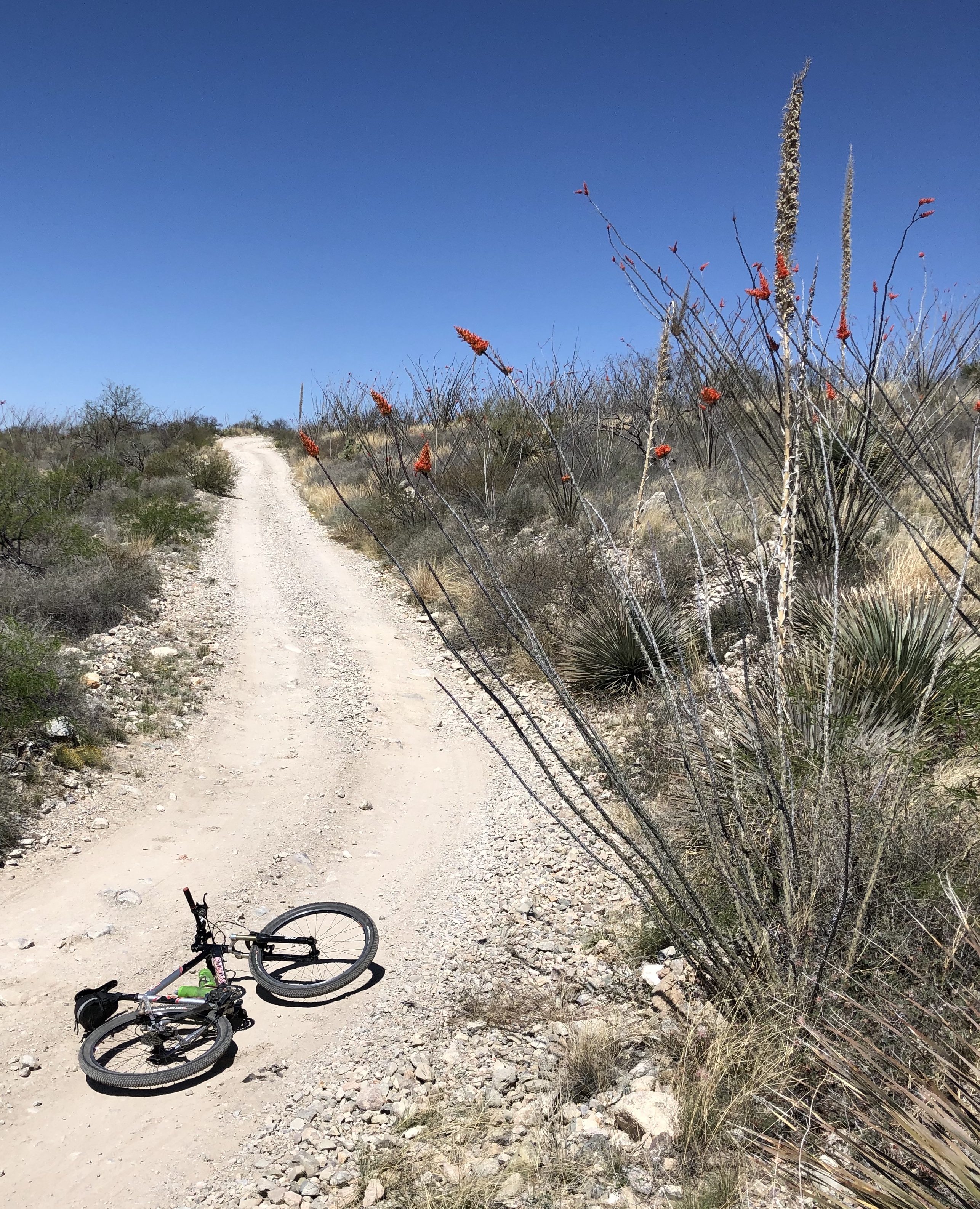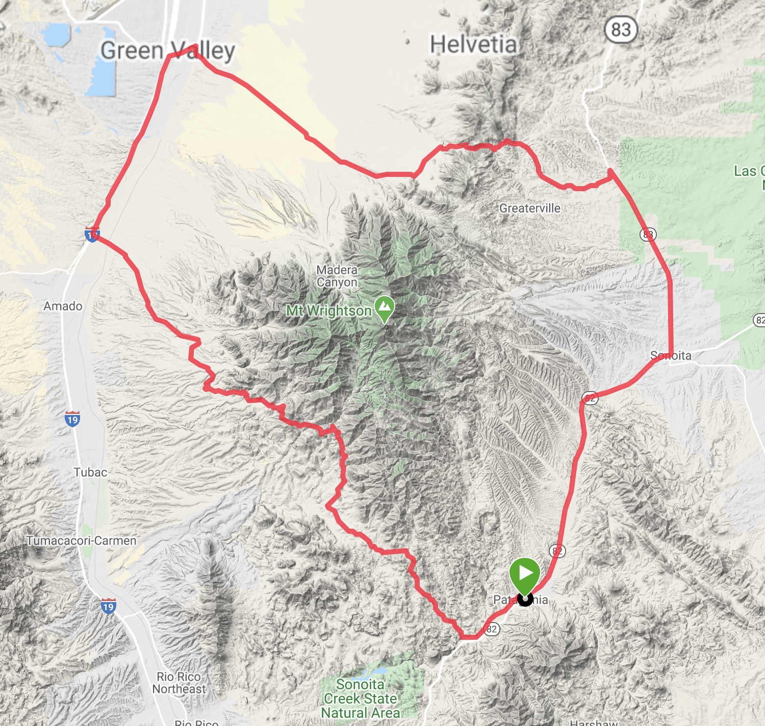 This is a wonderful loop around Mt Wrightson with two sections of dirt road and two sections of paved road. Both sections of dirt climb through beautiful country – remote in the case of FR 143 and popular in the case of Box Canyon. The ride is about 84 miles with 5,600 feet of climbing. I rode this 4/21/2020.