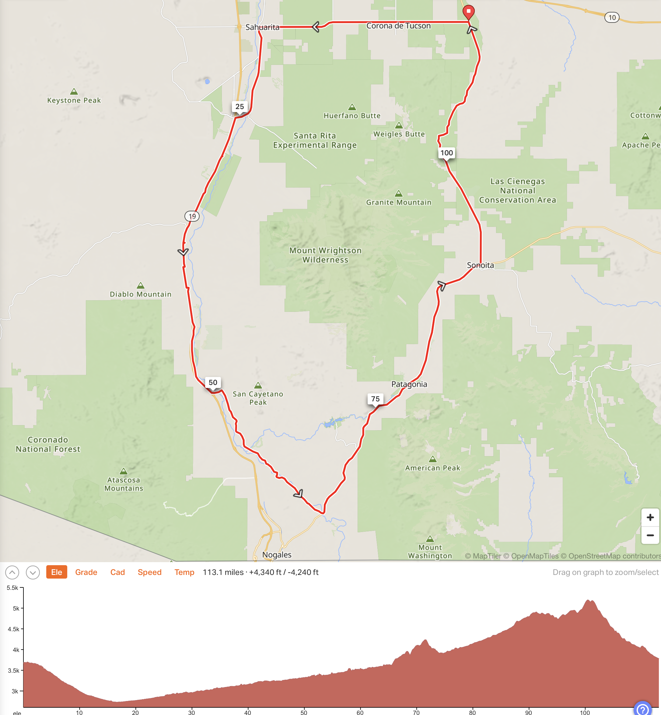This loop is a the shortest road loop around Mt Wrightson and the Santa Rita Mountains. It’s a mainly enjoyable loop of about 113 miles with about 4,100 feet of climbing. I rode it counter-clockwise, on 4/4/24.
