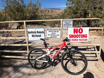 A few hundred yards past the “top” there’s a very obvious road to the left, with a sign saying Bellota Ranch. The ride is mainly downhill on the way out and up on the way back, although there are some good rollers. You will go through several gates, and perhaps enjoy the signs on the gates. Just before you get to the obvious Bellota Ranch buildings, take a very sharp right turn and continue on the dirt road through more gates, until it basically fades away. Turn around and ride back the way you came.