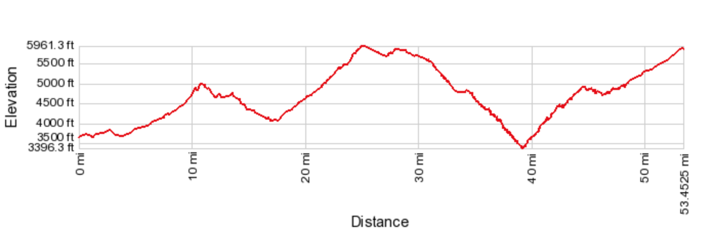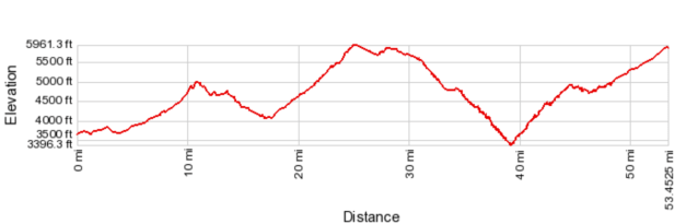 On the way back, there’s an obvious stopping point after the climb out of the canyon, at the old Seneca Lake trading post between mile markers 287 and 288. From here there’s a lot more climbing, then a long descent before the final big climb. GABA had an aid station on the right between mile markers 265 and 266, near the base of the final big climb.