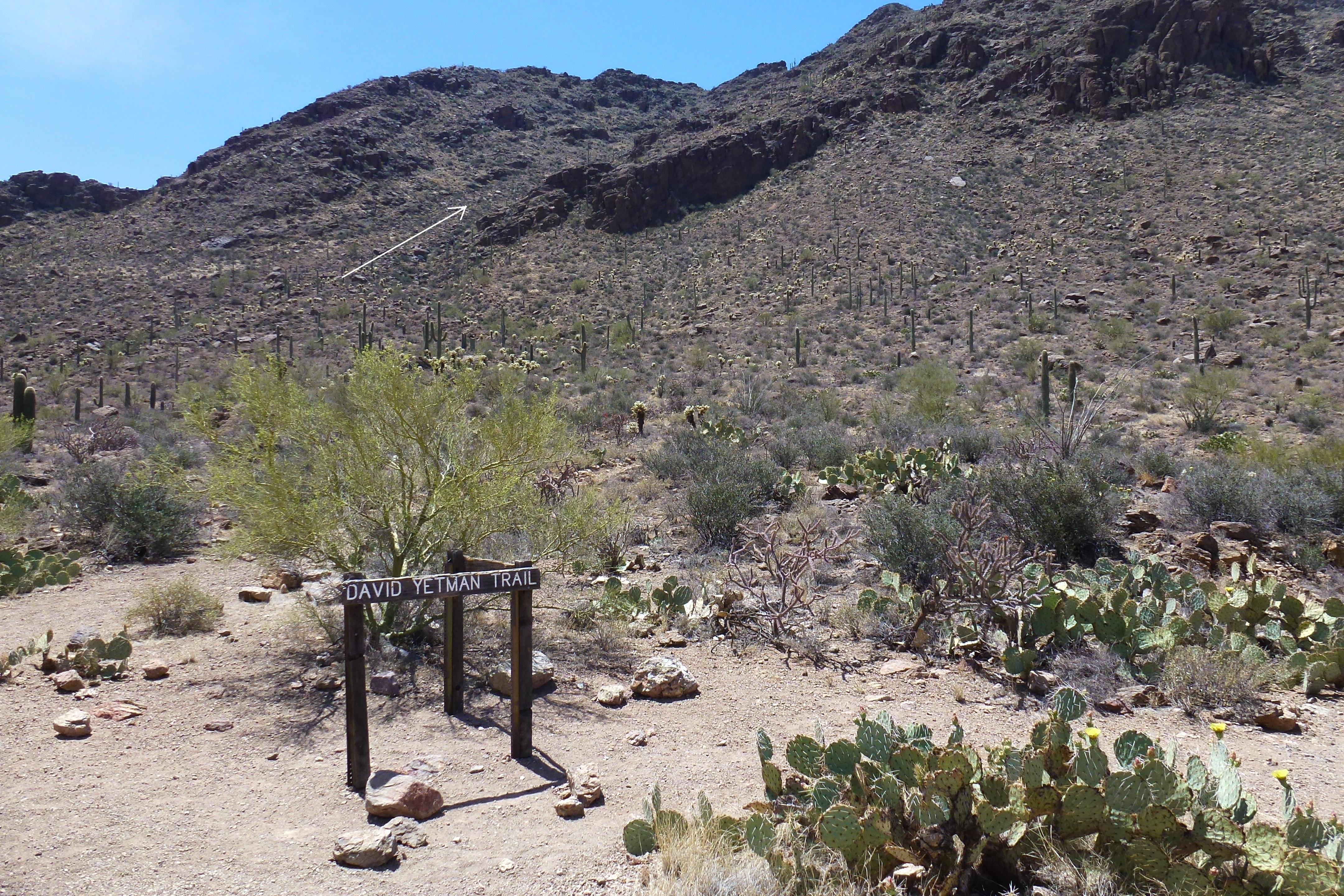 Drive west along Speedway and over Gates Pass. A few hundred yards past the top of Gates Pass is a large parking area on the left. This is the trailhead for the David Yetman trail. Park here. Golden Gate Mountain is the peak on the right as you look up the trail.