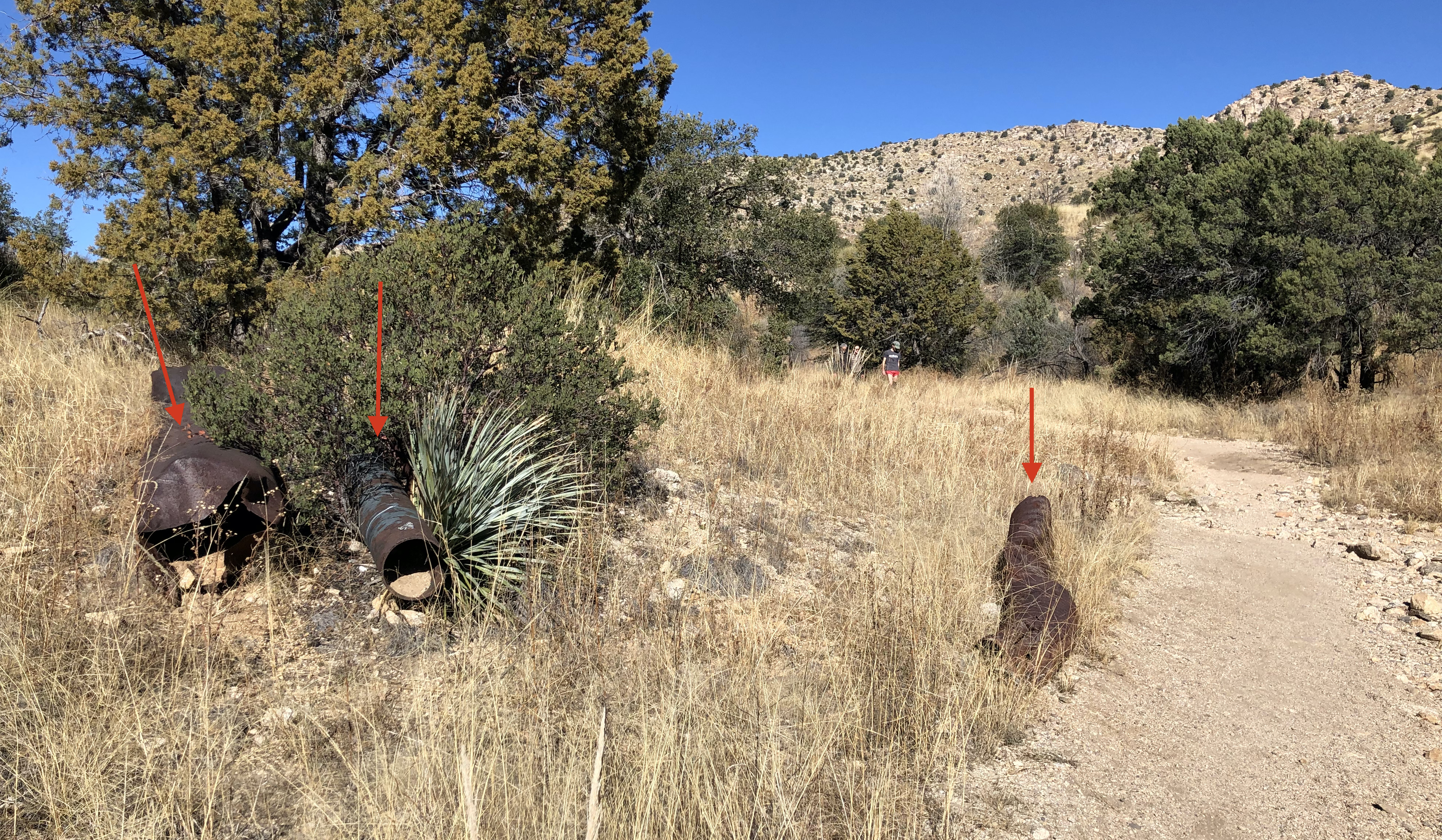 Follow the sign for Sycamore Canyon for less than half a mile, until you see three old sections of pipe on the left. (If you see three pipes on the right, or a pipe across the trail, you have gone too far.)