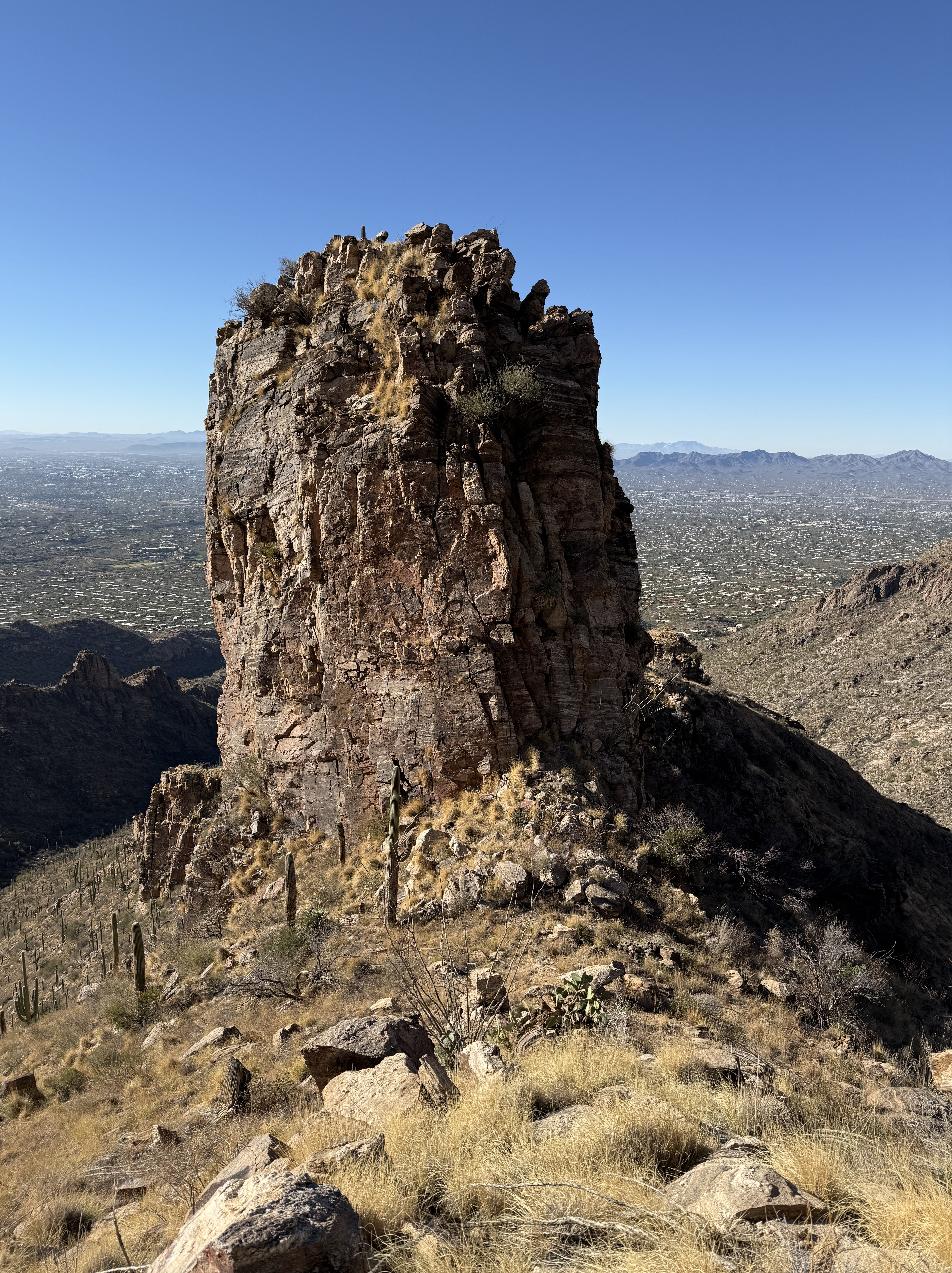 Park in the Finger Rock parking area near the very top of N Alvernon Way (32.33617103105634, -110.91009262061056), then walk up the road to the start of the Finger Rock trail and start walking up this. Your first goal is the cactus-covered rounded lump that starts the ridge (shown below), and you can approach this either from the Finger Rock trail or from the Pontatoc Ridge trail. I did it from the Finger Rock trail, crossing a dry river bed to get to the lump.